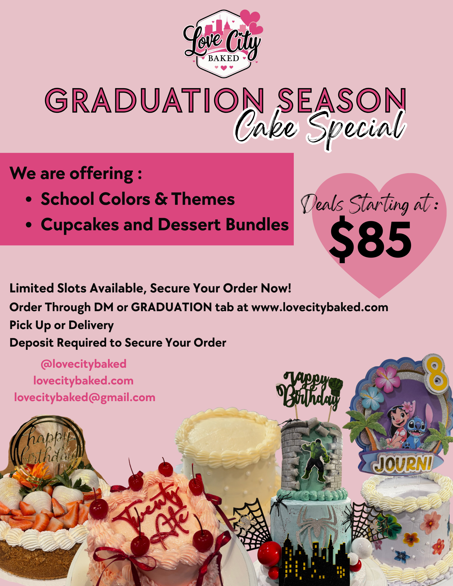 Custom Cakes, Cupcakes, Dessert Shooters & Cheesecakes!! All starting at $85, graduation decorations included, as well as school colors and themes.